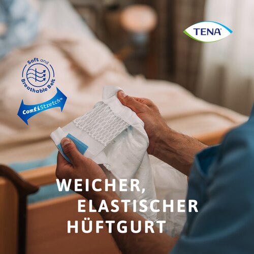 Die verbesserte TENA ProSkin Flex ist ideal für immobile und eingeschränkt mobile Nutzer*innen mit schwerer Inkontinenz. Der Hüftbund verfügt über eine erhöhte Elastizität, die sich an unterschiedliche Körperformen anpasst und so für einen bequemen Sitz und hervorragenden Auslaufschutz sorgt. Der Hüftbund besteht aus weichem, atmungsaktivem Material und lässt sich bequem von vorne oder hinten verschließen. Das bedeutet, dass das Produkt von hinten oder vorn angelegt werden kann, egal ob die Nutzer*innen sitzen, stehen oder liegen. Außerdem ist der Hüftbund mit der blauen Fingerlift™-Lasche ausgestattet, mit der die Bundöffnung leichter zu finden ist und das Produkt schneller einsatzbereit ist.