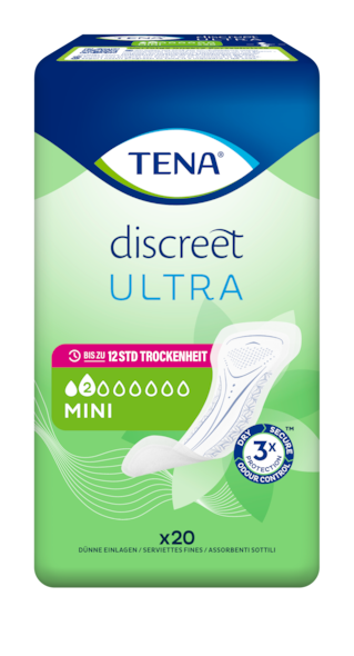 Die dünne TENA Discreet Ultra Einlage Mini bietet diskreten und sicheren Schutz bei leichter Blasenschwäche. TENA Discreet Ultra Einlagen sehen aus wie herkömmliche Damenbinden, funktionieren aber ganz anders. Sie schützen bei Auslaufen, Feuchtigkeit und Gerüchen und bieten eine langanhaltende Trockenheit bis zu 12 Stunden. So fühlst du dich den ganzen Tag lang sicher und frisch.