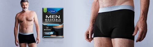 Die waschbaren TENA Men Washable Protective Boxershorts sind in elegantem Schwarz mit grauem Bund erhältlich. Die integrierte sichere Absorptionszone wurde ergonomisch gestaltet, um Tröpfchenverlust genau dort einzuschließen, wo es nötig ist.